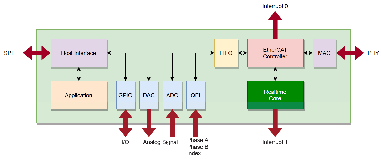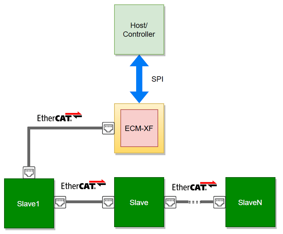 從上圖可以看出,Host/Controller(凡是有SPI接口的處理器芯片均可)通過SPI的通信方式,將運動算法(C語言,C++,VB,Python均可)傳輸至ECM-XF主站芯片,ECM-XF將其轉(zhuǎn)換成EtherCAT協(xié)議棧代碼分發(fā)給不同從站,從而實現(xiàn)EtherCAT傳輸。